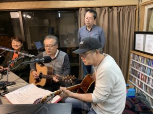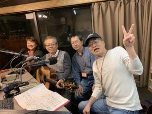 第75回 ゲストは『びんびん』さんです。前田敏郎さん、成瀬敏彦さん、中村志津子さん、吉村宏之さんです。敏郎さん+敏彦さんで”びんびん”です!びんびんの平均年齢(女性除いて)64歳です!!今日は日頃のライブで募金活動をされていたその募金箱の開封式もありました!CDから1曲、生演奏1曲素晴らしい演奏でした。平均60歳を超えるとは思えない演奏でした。